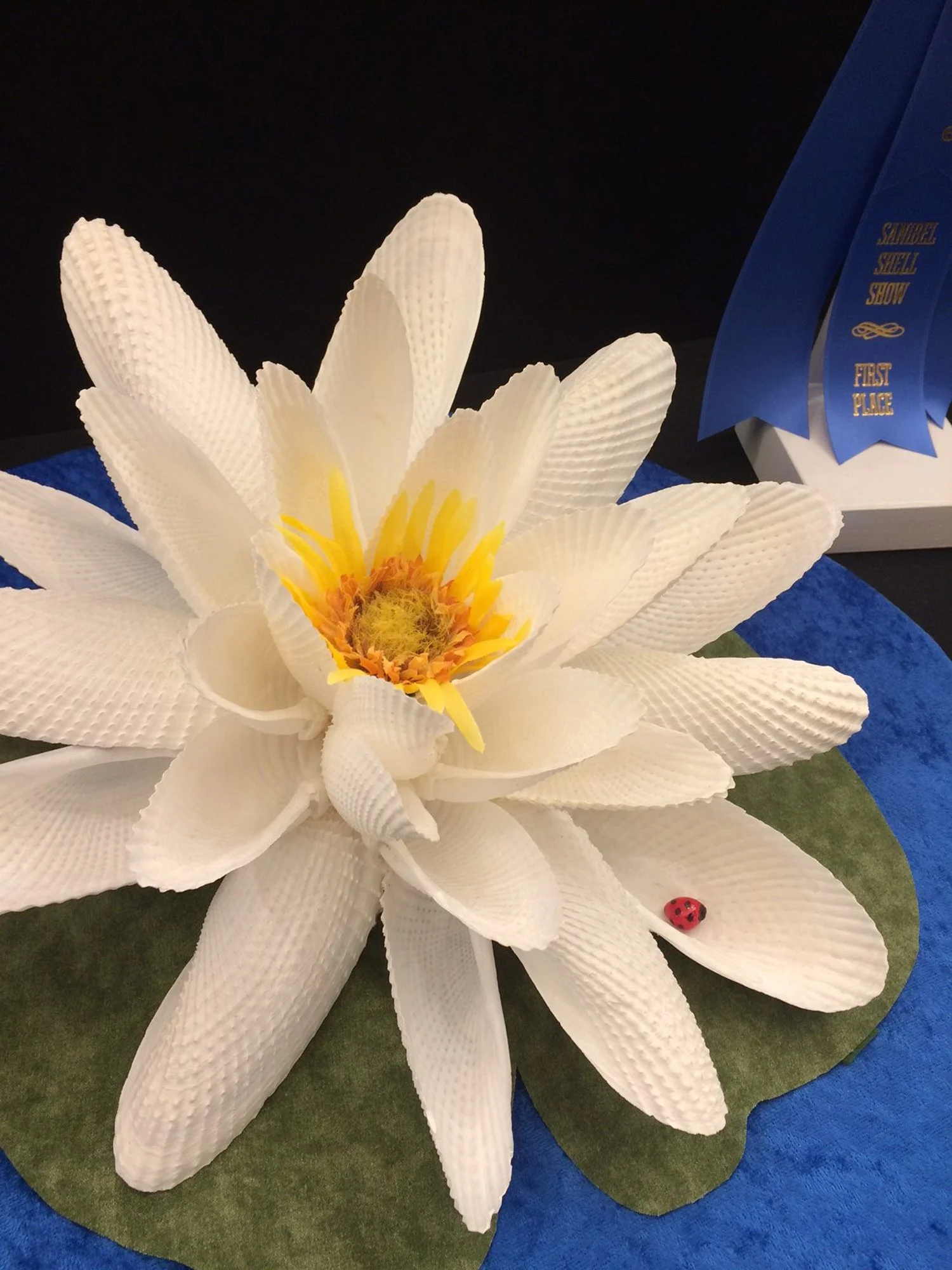 Water lily created from angel wing shells.