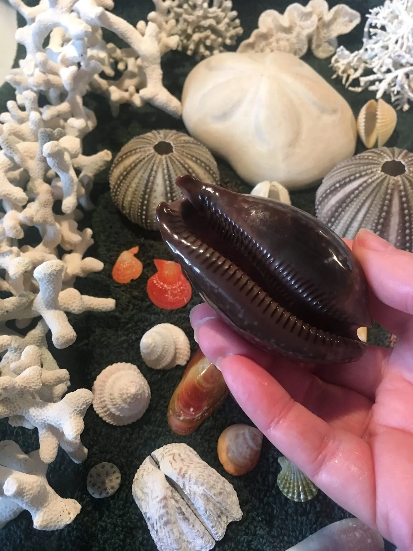 I hired Captain Matt for the first time several years ago, to take my sister and I out on the water. He was excited to explore and see what we could find. We ended up on a shallow reef and the goodies that we found were pretty epic. Cowries, sea biscuits, sunrise tellins, sea urchins, cones, and the most gorgeous bright yellow Antillean scallop that I’ve ever seen. (Thank you, Broward Shell Club, for confirming what type of scallop this was!) Photos of our beautiful treasures are below.