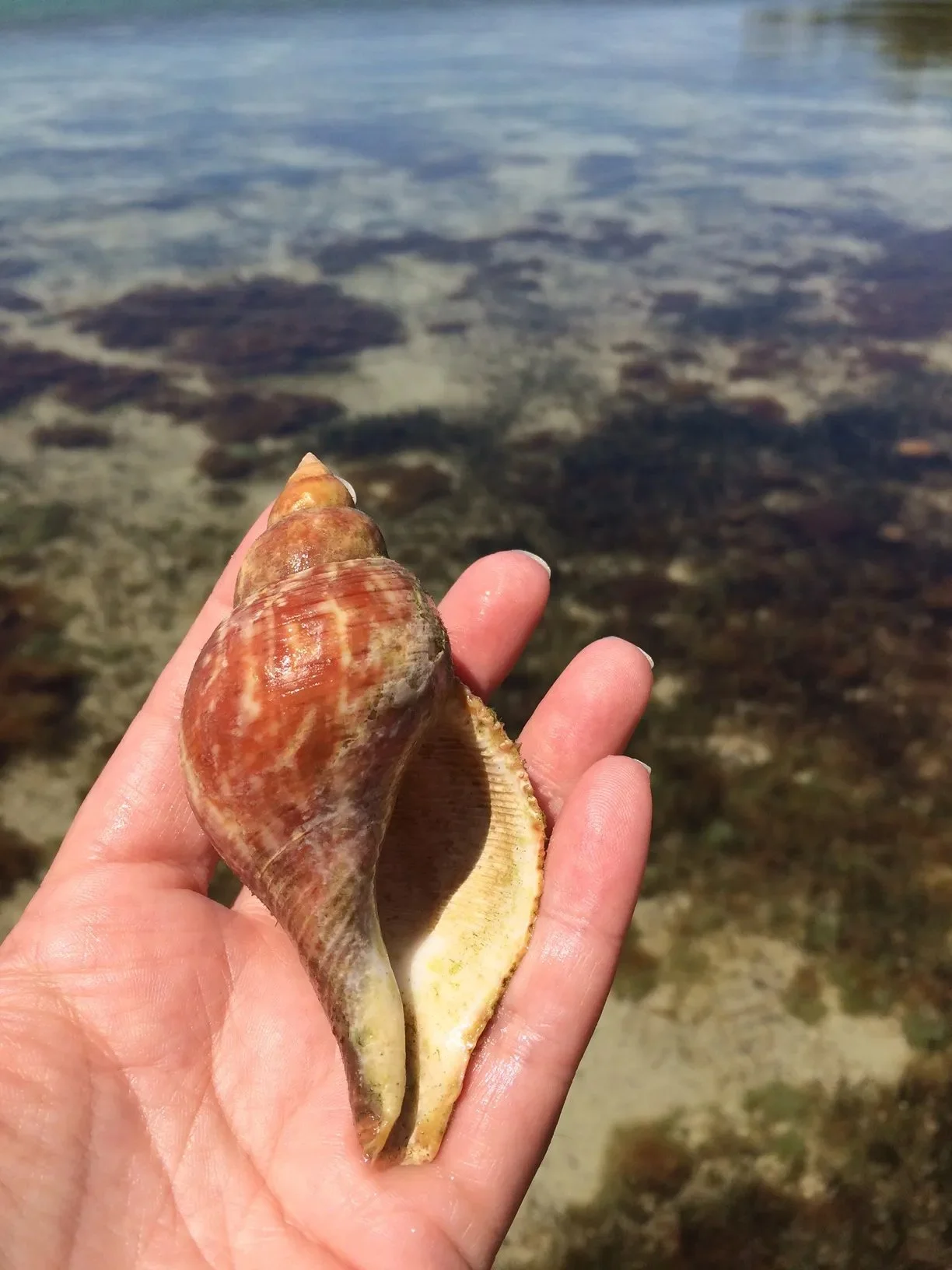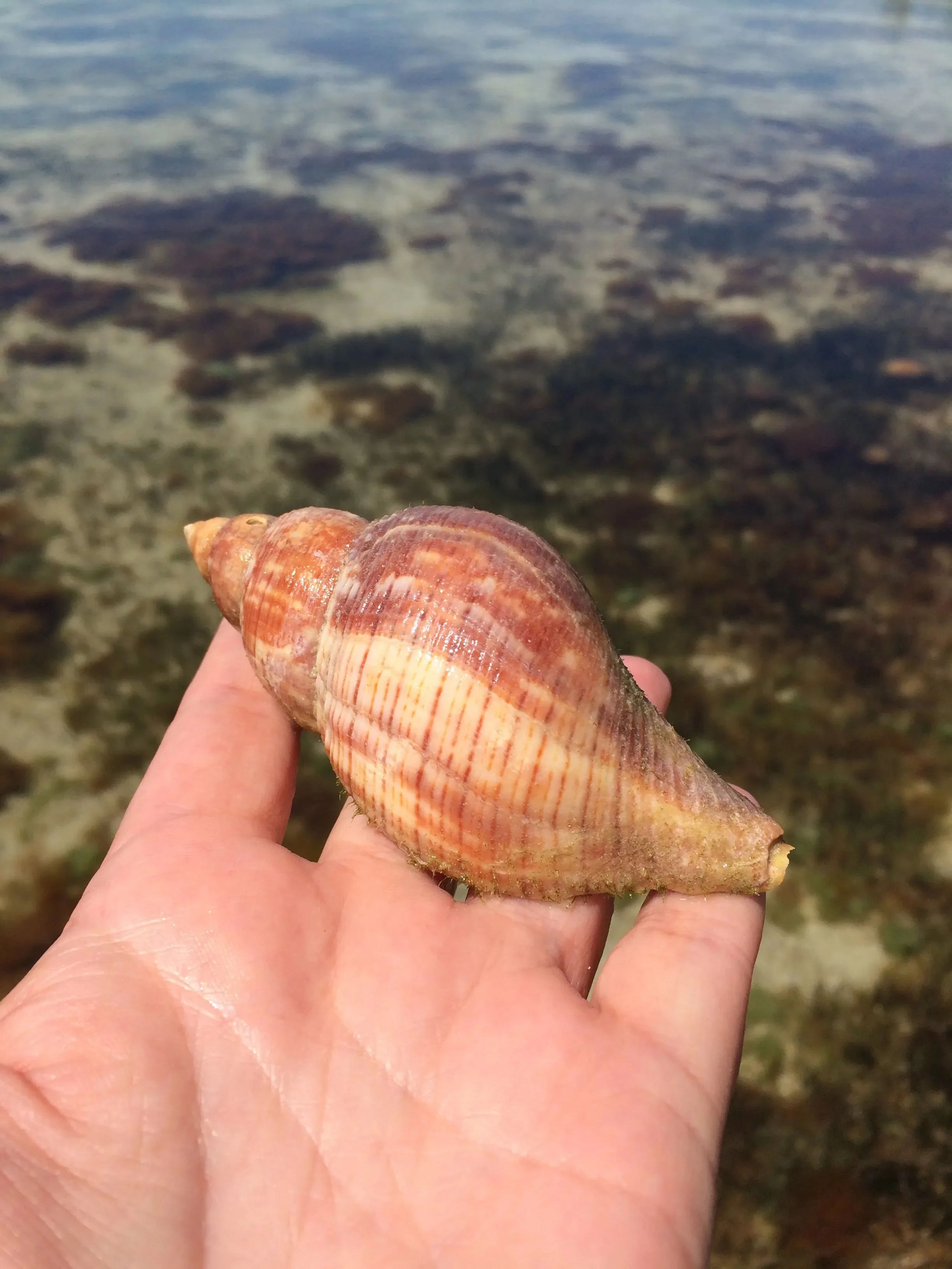 Speaking of crabs, after wading, I drove home and when I went looking for my tulip shell in my backseat, it wasn’t there. Say what? Then I spied it, under my seat. It had crawled away! Yep, there was a stinkin’ hermit crab hiding REALLY GOOD in that big tulip.
